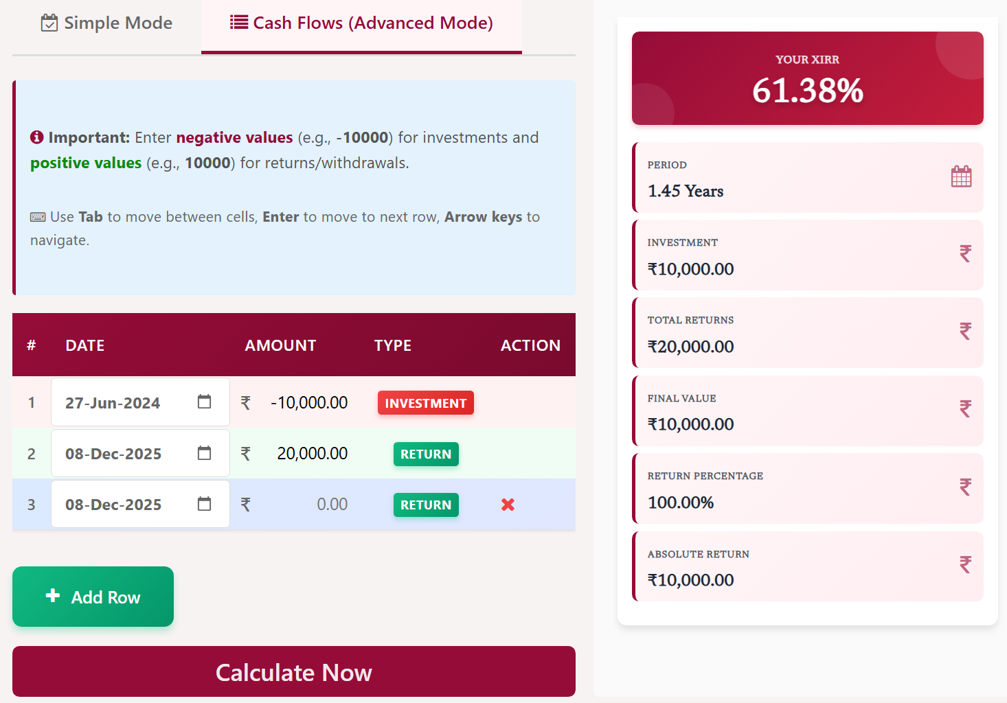 The XIRR calculator is designed to help you understand your real investment returns by considering the exact dates of your cash flows. The calculator on this page provides two modes Simple Mode and Cash Flows Advanced Mode. You can choose either one depending on how detailed your data is. Below is a complete step by step explanation of how to use both modes based on the actual flow of the tool.